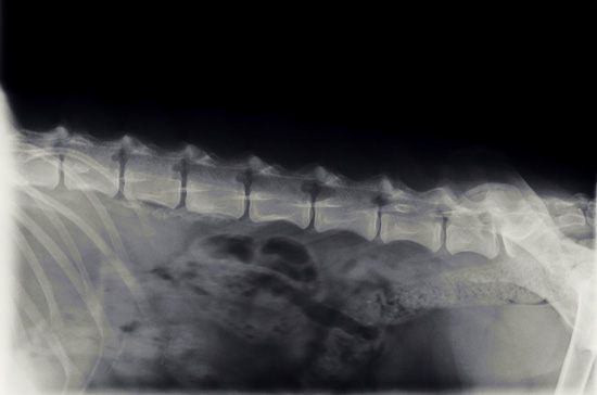 Frauchen hat das keine Ruhe gelassen und mich wieder in die Tierklinik gebracht. Dort wurde ich geröntgt und man hat auf dem Röntgenbild unter der Wirbelsäule so eine